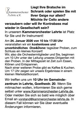 Wir sind ein Laienorchester: etwa 30 Menschen, die Musik lieben und Streich- oder Holzblasinstrumente spielen. Unsere Mitglieder kommen aus der gesamten Region Hannover.